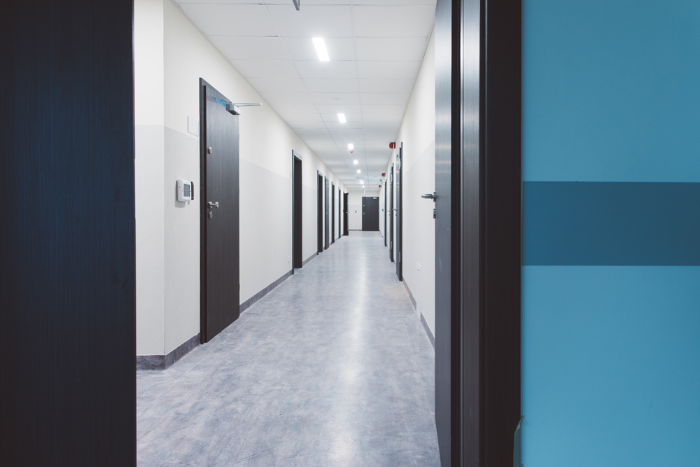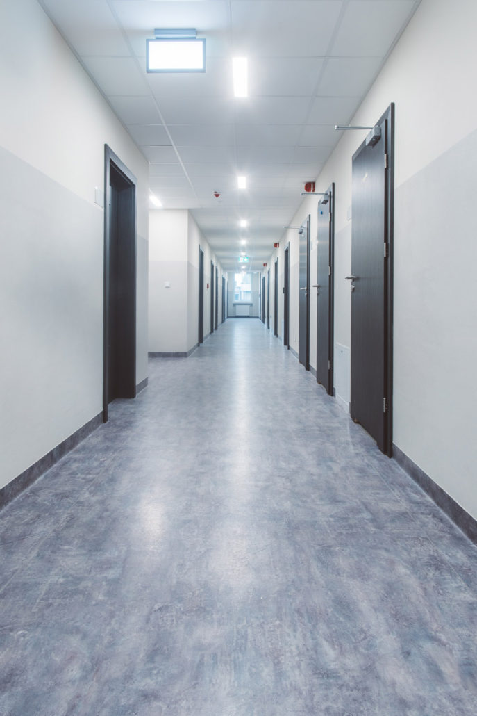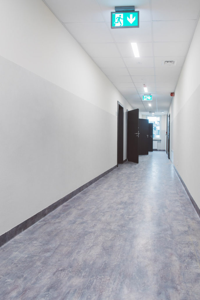 WYKORZYSTANE MATERIAŁY/ PRODUKTY/ ROZWIĄZANIA: Wysoce antypoślizgowa wykładzina PVC Novoflor Extra Grit (kolory: 2016-2 i 2016-56) – pokoje i korytarze, I i II piętro; Przeznaczona do przestrzeni o charakterze sportowym wykładzina Rekord Sport, kolor jasnoszary (200131008) – sala sportowa