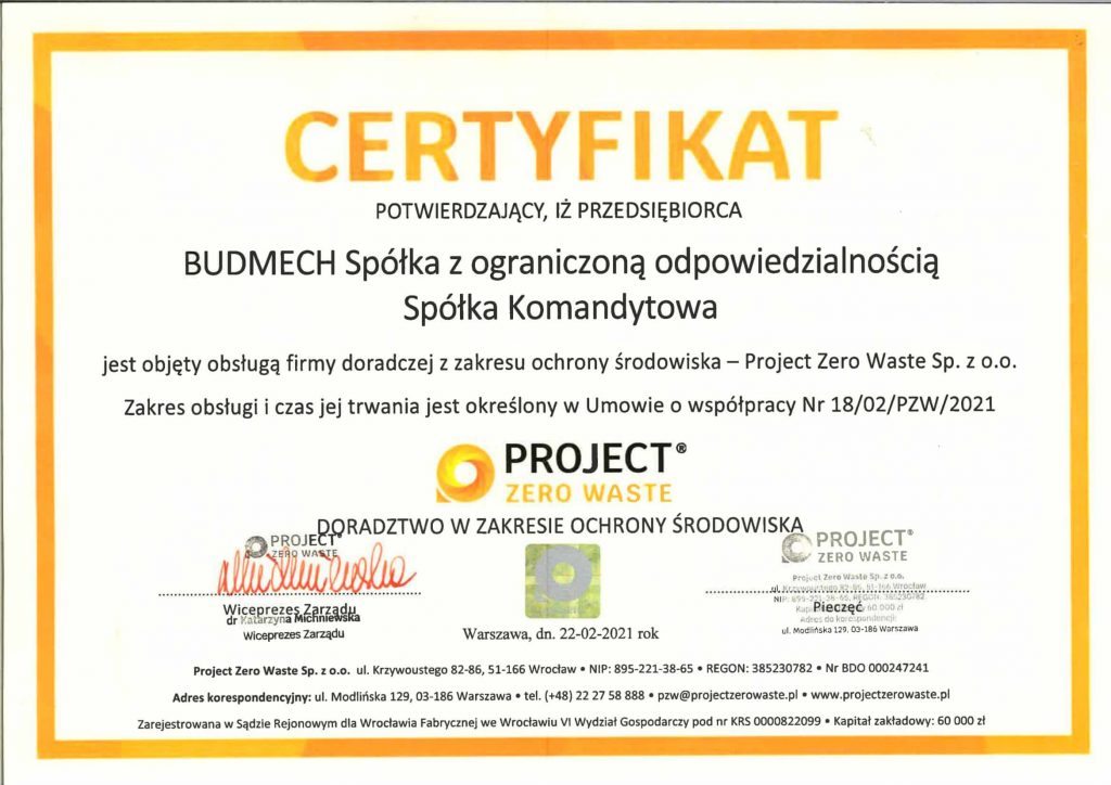 Miło nam poinformować, że firma Budmech podjęła współpracę z wyspecjalizowaną firmą doradczą Project Zero Waste. Celem wspólnych działań jest poprawa poziomu zarządzania odpadami i produktami opakowaniowymi. Działania w zakresie ochrony środowiska są zgodne z filozofią firmy. W ramach wspólnej inicjatywy, Budmech otrzymał stosowny Certyfikat.