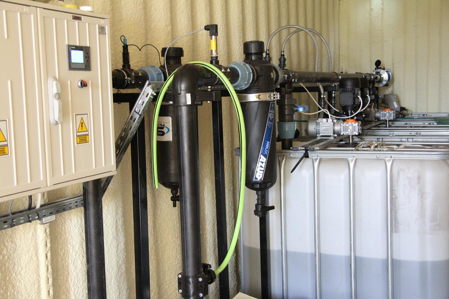 Jako budynek przepompowni wykorzystano kontener morski ocieplony pianą natryskową. Jest to rozwiązanie trwałe, szybkie w realizacji i skutecznie zabezpieczające przed dostępem osób nieupoważnionych. Jednocześnie w razie potrzeby istnieje możliwość zmiany lokalizacji pompowni w przypadku modernizacji lub rozbudowy instalacji. W kontenerze ulokowano sterownik, urządzenia pomiarowe, pompy dozujące, zbiorniki na pożywkę i kwas wraz z mieszadłami oraz niewielki magazyn nawozów. Dodatkowo zainstalowano system wentylacji mechanicznej oraz zdalnego monitoringu otoczenia. W celu zachowania prawidłowej ochrony sensorów pomiarowych na wejściu układu znajduje się filtr dyskowy Azud Helix, drugi taki sam filtr zlokalizowany jest na wyjściu układu hydraulicznego i spełnia funkcję ochronną dla elektrozaworów i linii kroplujących wychwytując zanieczyszczenia niesione np. z koncentratami nawozowymi.