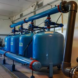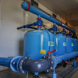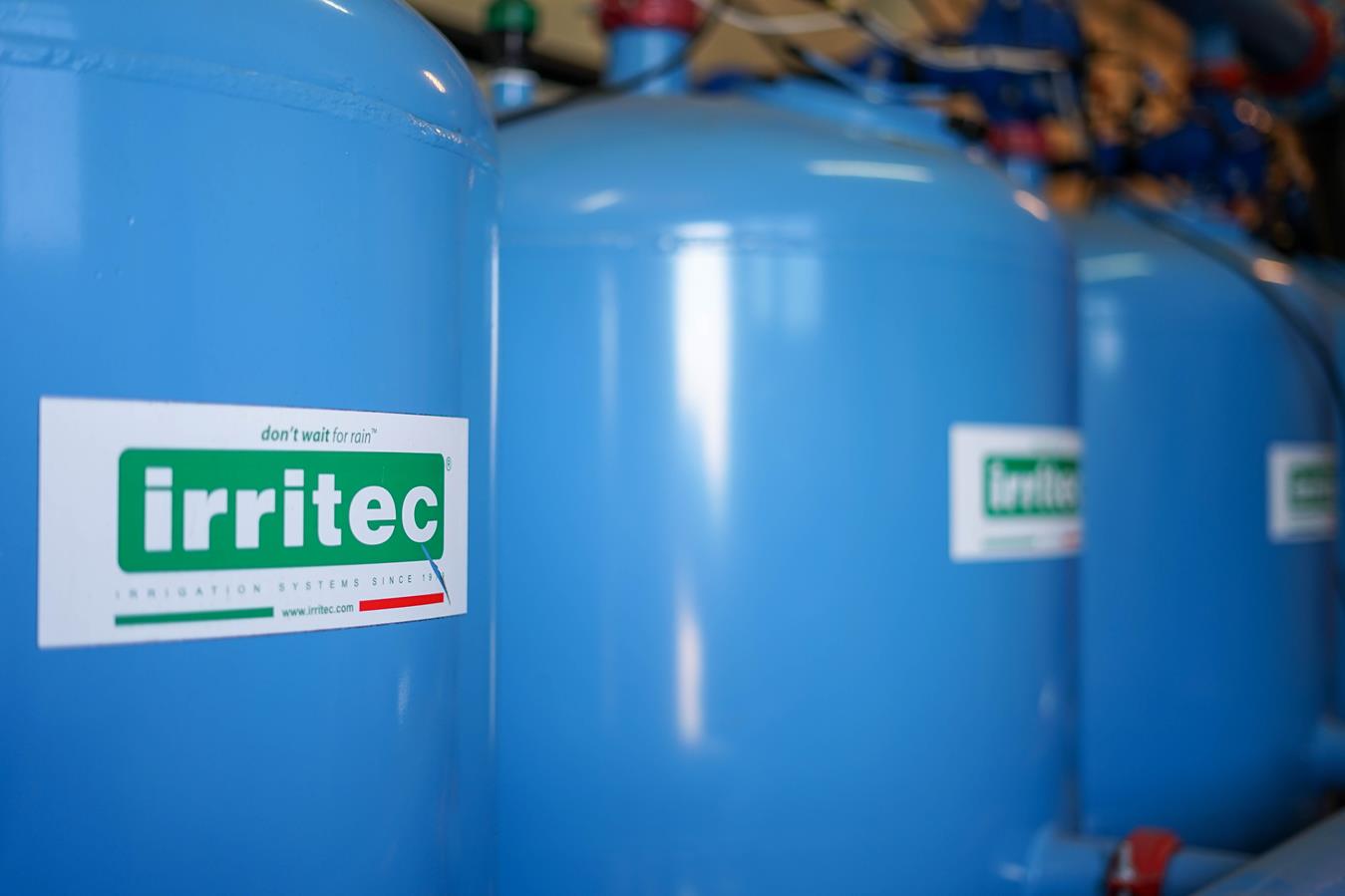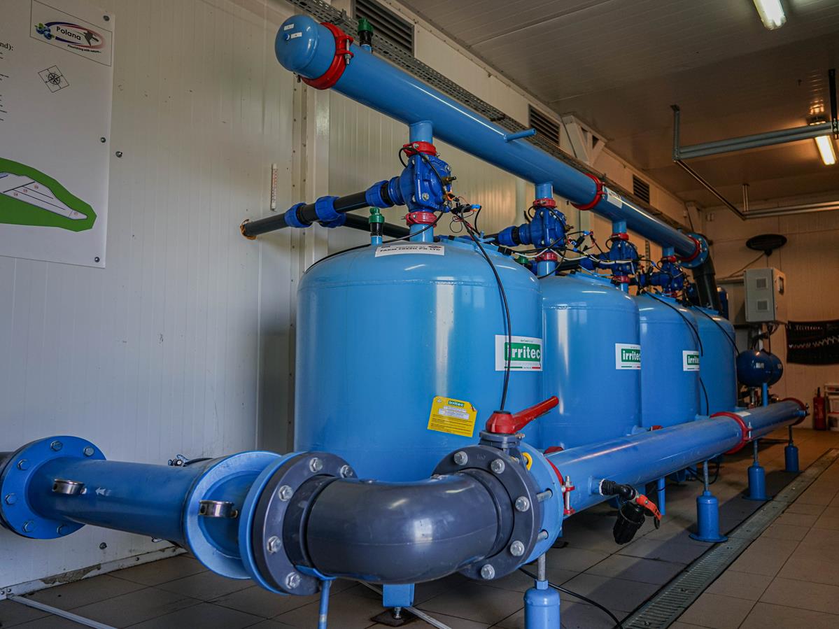 System filtracji stanowią 4 filtry piaskowe 900 mm o przepustowości 160 m3, jednak w związku z wysoką jakością wody, przekroczenie tej wartości przy największych sekcjach nie stanowi problemu. Ze względu na rozmiary plantacji i fakt, że nawadnianie trwa w trybie ciągłym, filtry płukane są ze stałym interwałem czasowym. Układ taki pozwala na uniknięcie spadku wydajności nawadniania, spowodowanego zapychaniem filtrów.
