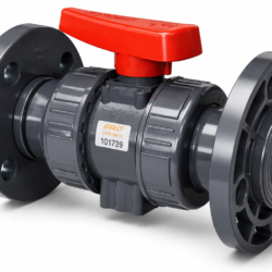 Przemysłowy zawór kulowy wykonany z PVC-U z pełnym przepływem, przeznaczony do instalacji wodnych, chemicznych i przemysłowych. Uszczelnienie PTFE kuli z regulowanym dociskiem oraz podwójne uszczelnienie trzpienia zapewniają wysoką szczelność i odporność na media chemiczne. Wyposażony w gniazda do montażu siłownika oraz gwintowane wkładki montażowe w podstawie, co ułatwia integrację z systemami mocowania.