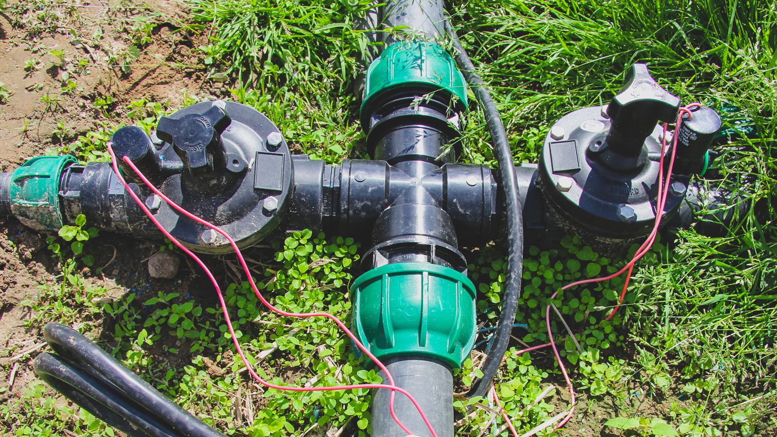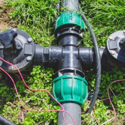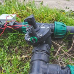 - Trójnik PE z elektrozaworem Bermad w instalacji nawadniania kroplowego — węzeł rozdzielczy systemu automatycznego nawadniania