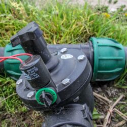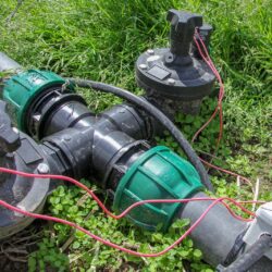 - Zbliżenie na elektrozawór systemu nawadniania kroplowego — element automatyki instalacji nawodnieniowej papryki z zastosowaniem taśmy kroplującej Irritec Tape