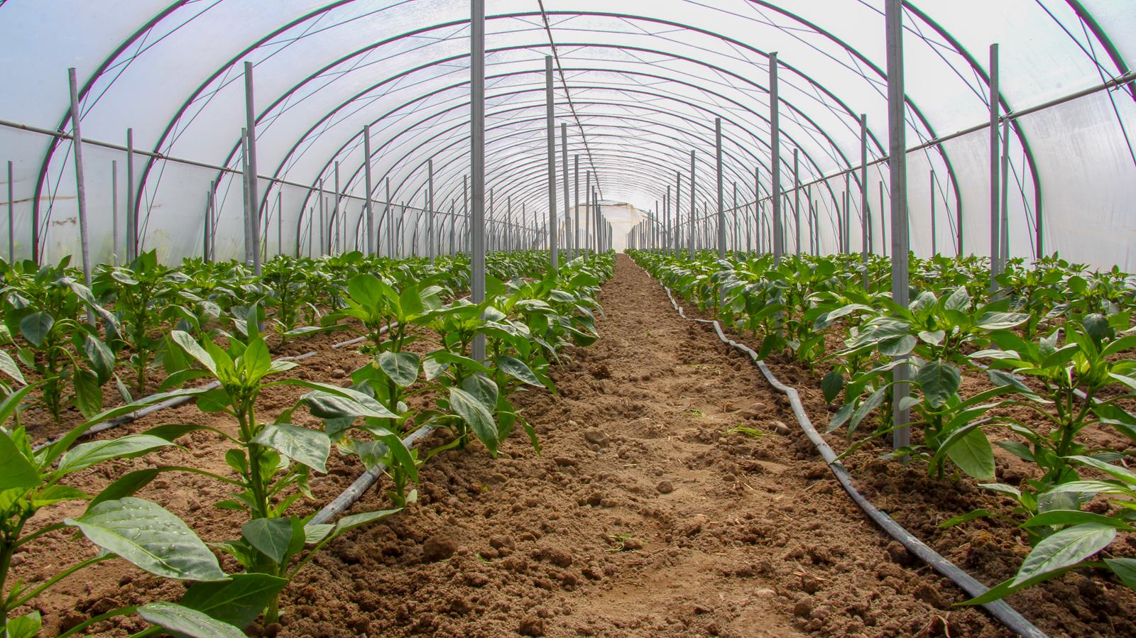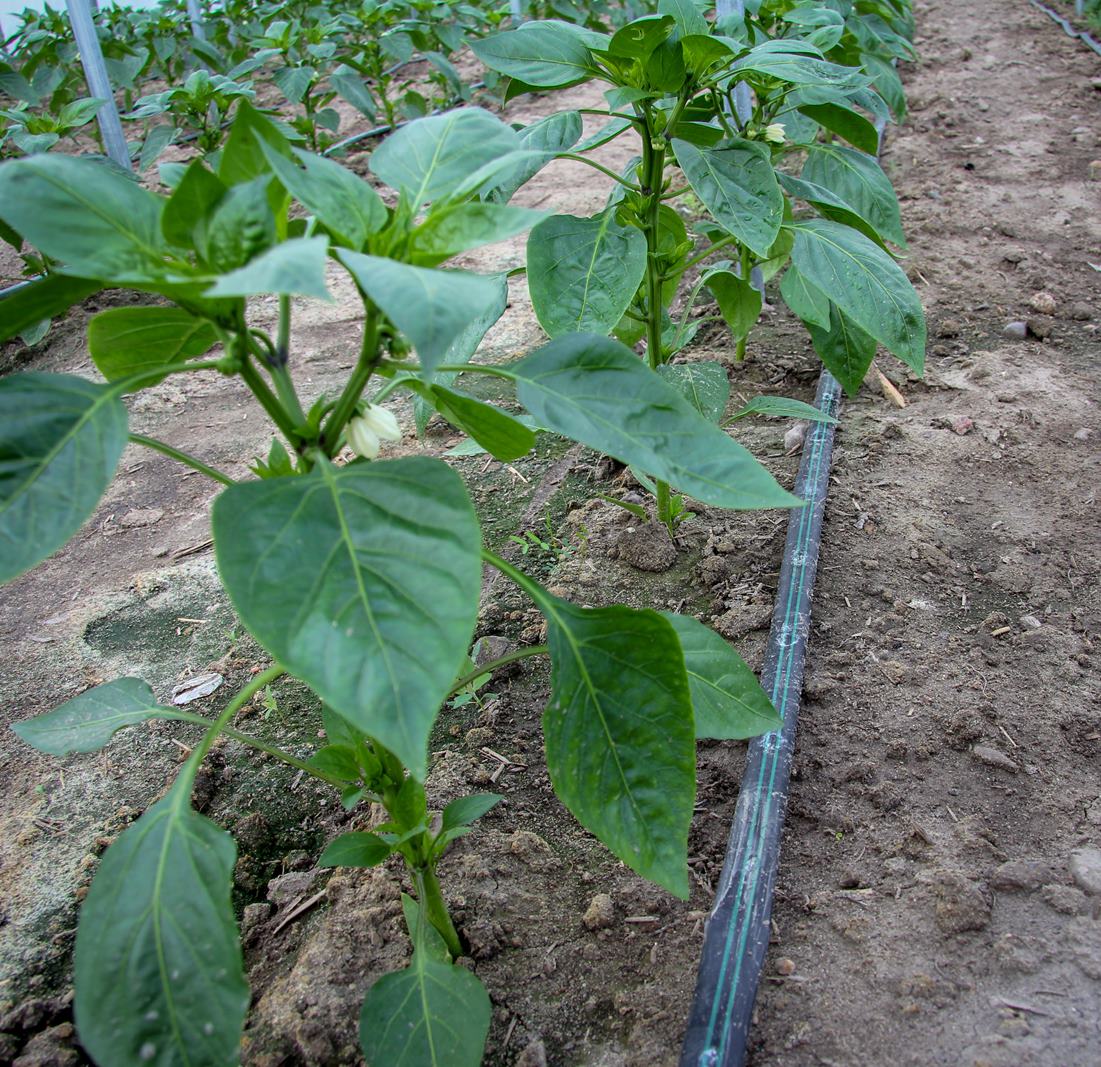 - Rzędy papryki nawadniane kroplowo — taśma kroplująca Irritec Tape ułożona przy nasadzie roślin w uprawie w tunelu foliowym